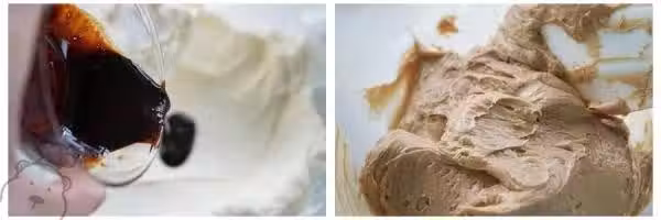 4、 鬆弛好的麵糰擀扁,翻面,包入一小勺乳酪餡(約15-20g),收緊介面,放烤盤上,在烤箱裡進行二發,38度約半小時;