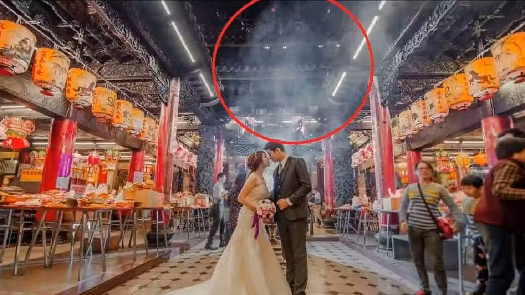不過許多網友卻覺得夫妻倆上方的煙霧看了很不舒服,仔細看似乎上面有一張人像,還用了紅圈圈標示出來,由於這張照片是在鎮瀾宮拍攝,因此不少人認為可能是媽祖顯靈,一起來送上祝福了!但也有人認為就只是單純煙霧巧合而已,不需要過度迷信或揣測。