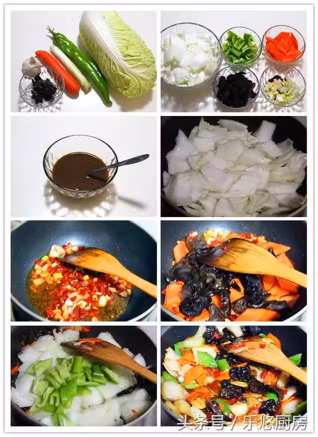 第七步:將白菜和尖椒放入鍋中煸炒1分鐘。