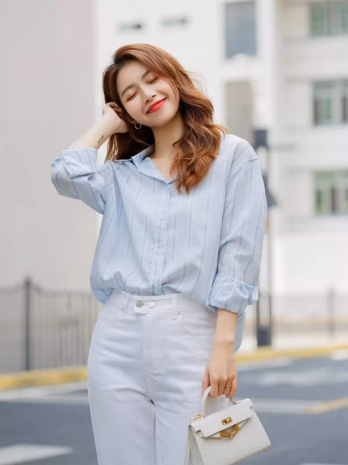 女生拍照,有很好的一個條件可以讓著你的手不用擺剪刀手,那就是頭髮啦,假裝自己的頭髮很散亂,讓自己自然的抬起手來。