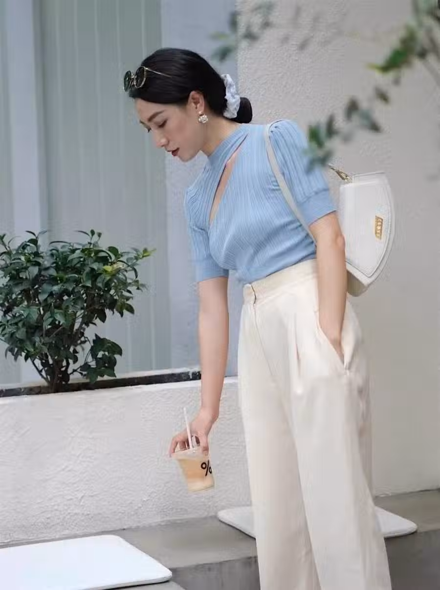 建議大家在搭配霧霾藍+其他色系的時候,最好利用色差將身材的比例進行修飾襯顯,尤其是五五身材的女性,上短下長的搭配組合最為襯托好比例,加上霧霾藍色的氣質襯托,襯得穿衣人更顯高級。