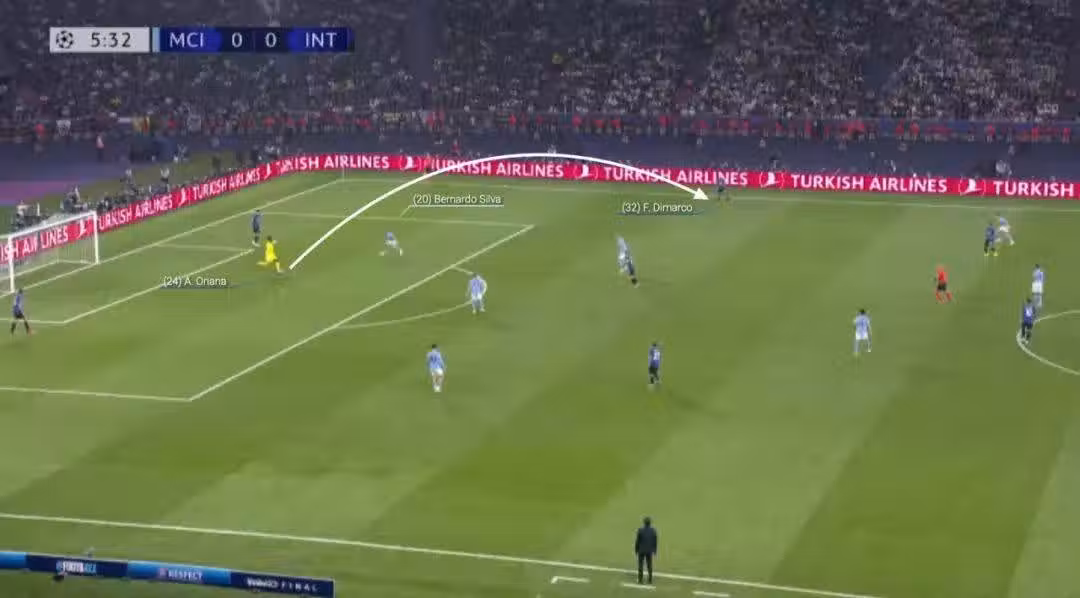 擁有奧納納,一個敢在後衛前面控球的守門員,國米可以吸引對手更多球員進入前場搶球,然後門將把球送到中前場,此時他的隊友就會獲得更大的空間。在奧納納控球時,中衛可以向兩側拉開,邊衛則向前推進,創造出適合傳接球的環境。