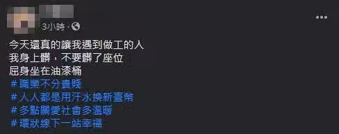 照片中可以看到一名頭戴工程帽的中年男子坐油漆桶上,頭低低的滑著手機,而這油漆桶還是工人自己帶的,照片曝光後2個小時就破萬人按讚,不少人紛紛留言「高尚的人格」、「做最骯髒的工作,賺最乾淨的錢」、「他有考量到其他乘客,真的很有心」、「好不捨」、「這就是公德心」、「這些人比那種倚老賣老搶博愛座的人更值得尊敬」、「真的是守規矩的老師傅」。