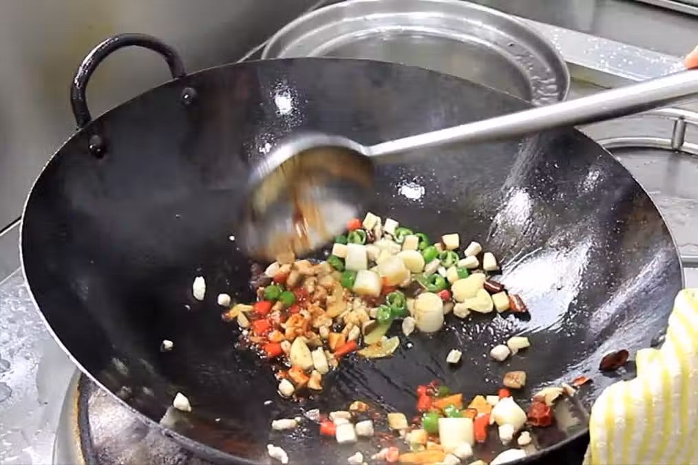 4、鍋內留底油,放入蔥薑、蒜、乾辣椒一起翻炒,翻炒出香味以後,倒入肉粒、香菇粒、和青紅椒圈繼續翻炒,放入豆瓣醬5克,炒出豆瓣醬的紅油,再加入蠔油和生抽2克提一下鮮味,翻炒化開以後,淋入料酒3克去腥,加入適量的清水。