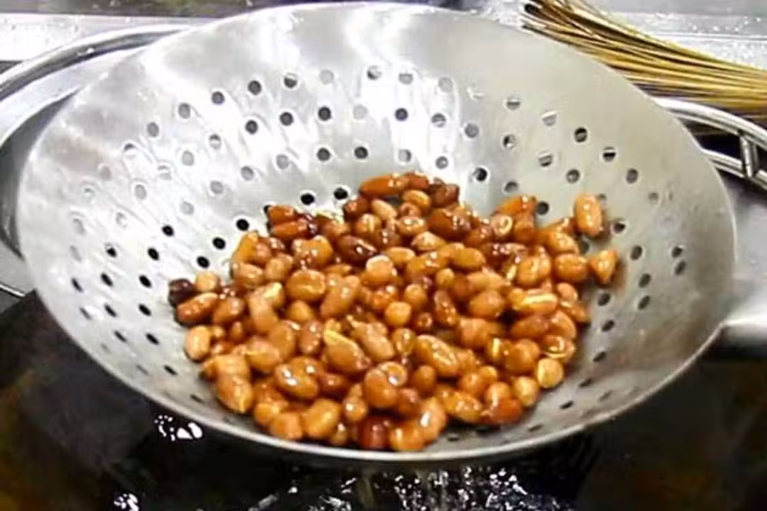 3、鍋里燒油,涼油倒入花生米,開小火慢慢炸,外皮稍微變紅,並聽到噼啪的炸裂聲,大概響7到8下花生米就熟了,撈出來控油冷卻。