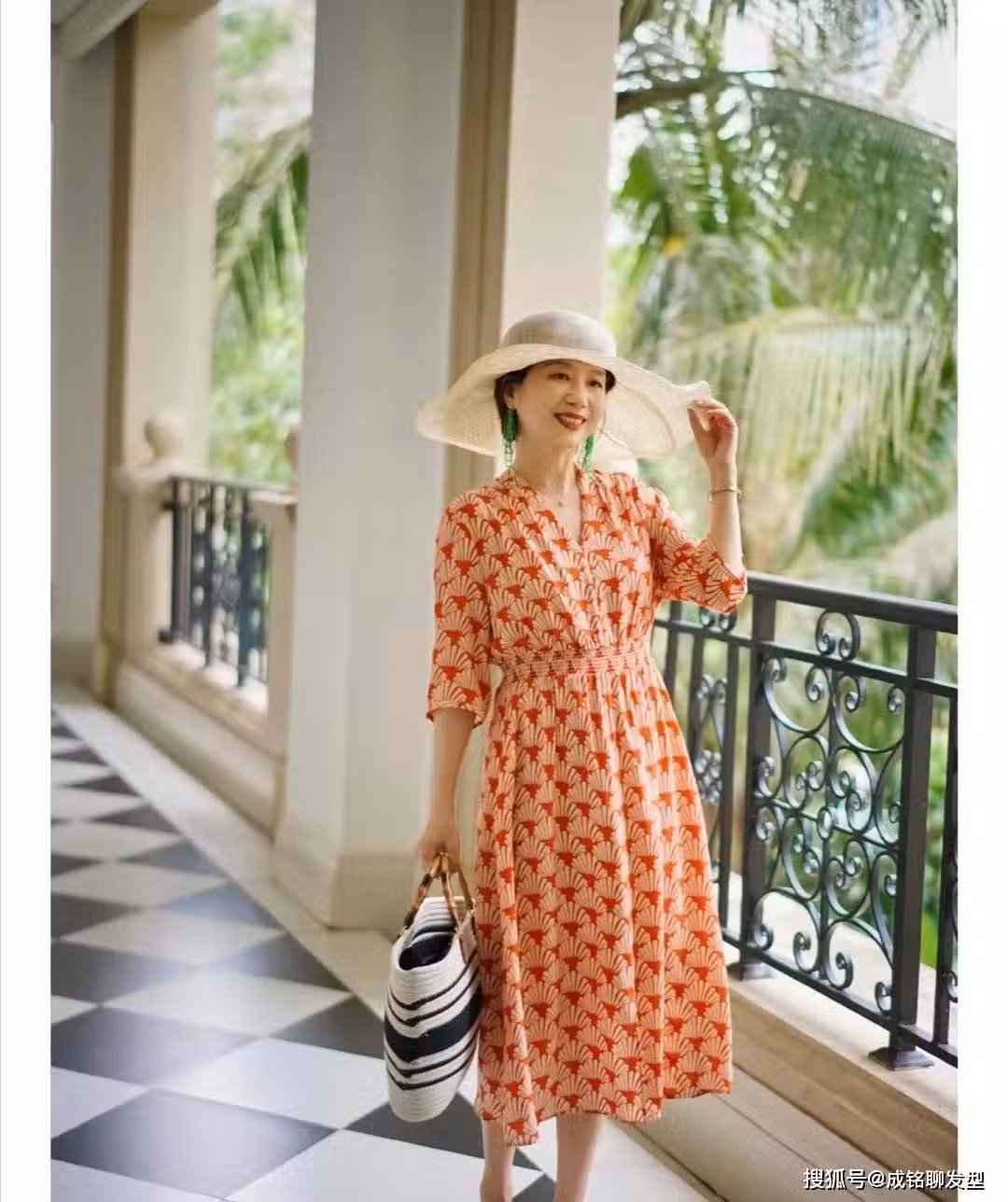 露耳樣式的短卷發,會帶來特別大氣的形象。搭配一款藍白印花連衣裙,用這種清新的配色,淡化夏季的悶熱感,V領的裁剪,又能大大的延長頸部曲線,更為高雅。