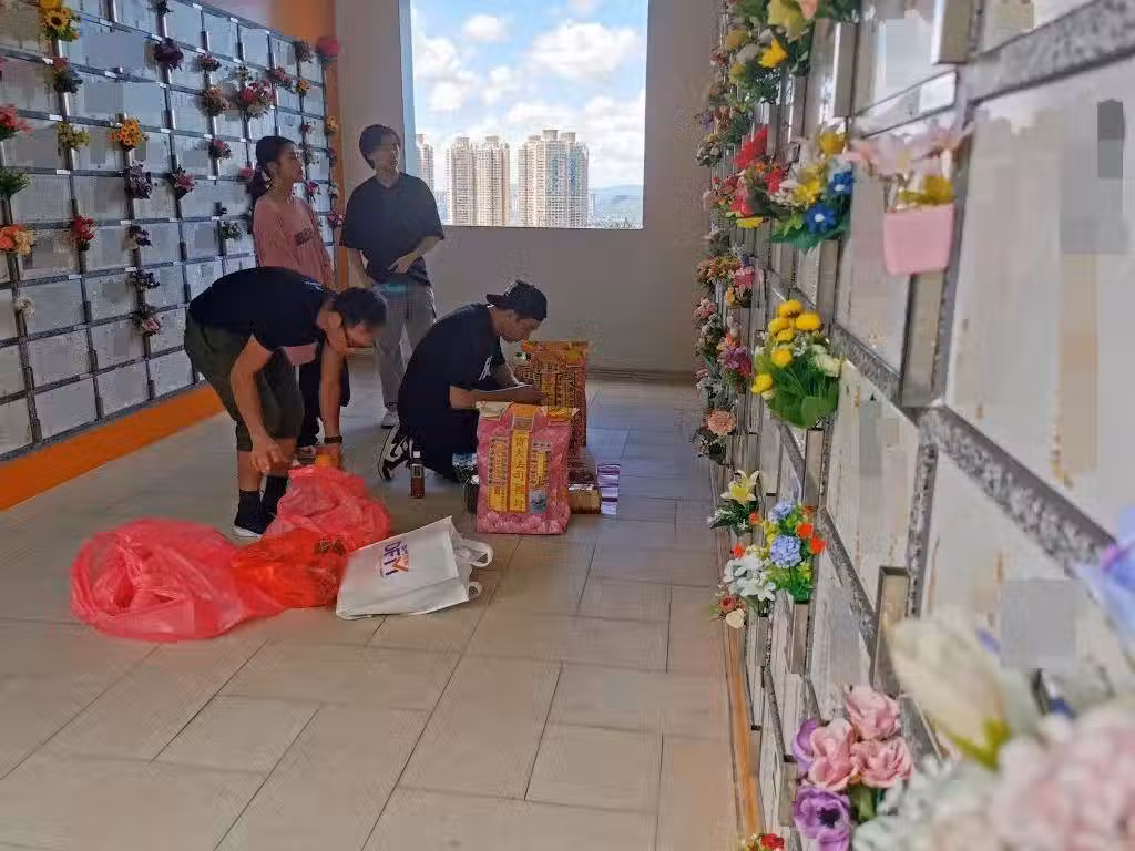 大概逗留半小時,收拾好物品後,兩子女緊隨爸爸拎著香燭、衣包去化寶爐燒祭品,讀者以為林子博化完寶便離開,「子女上車後,林子博突然一個人折返,獨自在亡妻的靈灰龕位前低頭肅立了幾分鐘,再非常感觸地去摸住靈灰位中上太太的照片,然後依依不捨離開,我看著都有點心酸。」