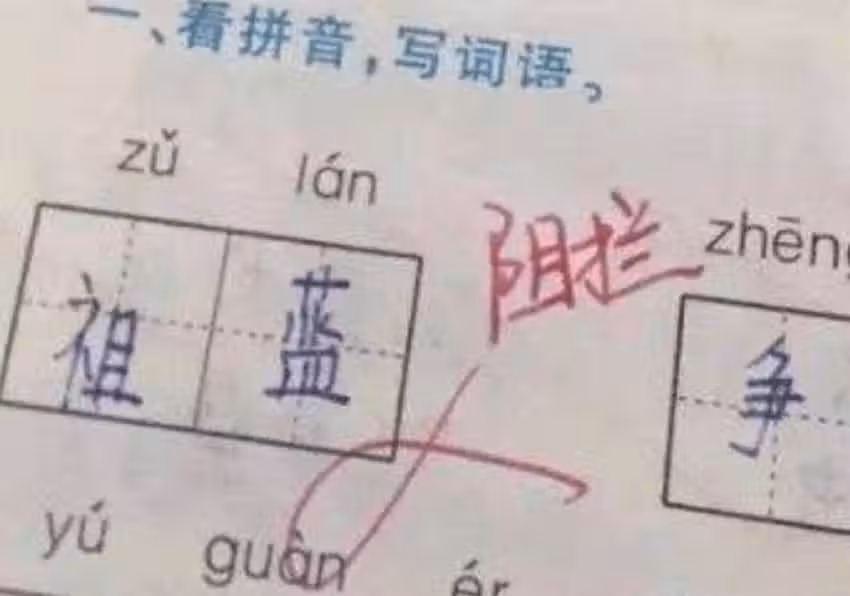 就像是這道題,題目中給出的是「阻攔」的拼音,但是大家都知道,也有「祖藍」的存在,所以有人認為,並沒有規定一定要寫哪個,所以覺得小學生的回答並沒有錯,但終究老師是不會容忍的, 直接判叉,並寫上了「正確答案」。