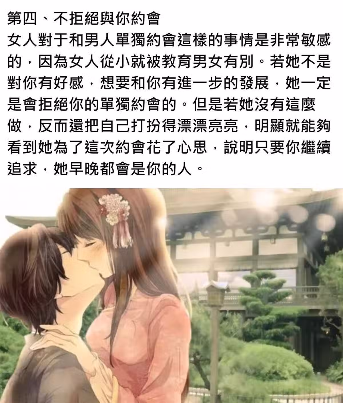 女人對於和男人單獨約會這樣的事情是非常敏感的,因為女人從小就被教育男女有別。若她不是對你有好感,想要和你有進一步的發展,她一定是會拒絕你的單獨約會的。但是若她沒有這麼做,反而還把自己打扮得漂漂亮亮,明顯就能夠看到她為了這次約會花了心思,說明只要你繼續追求,她早晚都會是你的人。