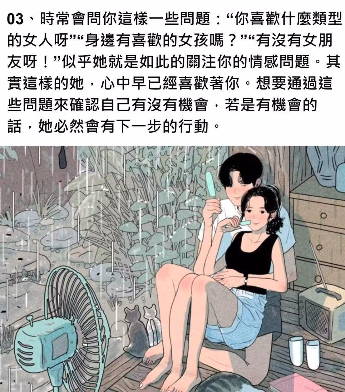 03、時常會問你這樣一些問題:「你喜歡什麽類型的女人呀」「身邊有喜歡的女孩嗎?」「有沒有女朋友呀!」似乎她就是如此的關注你的情感問題。其實這樣的她,心中早已經喜歡著你。想要通過這些問題來確認自己有沒有機會,若是有機會的話,她必然會有下一步的行動。