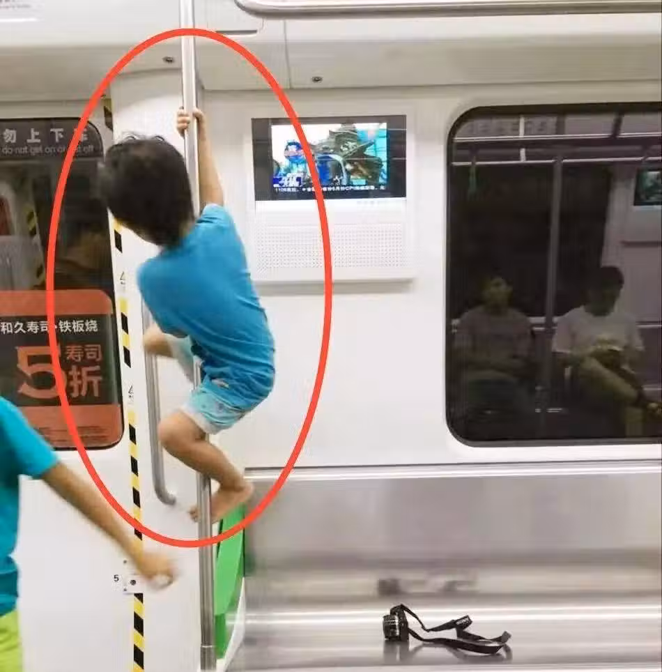 比如這位孩子,把地鐵上的手扶杆當成了攀爬的玩具,在地鐵上給大家表演「猴子上樹」呢。
