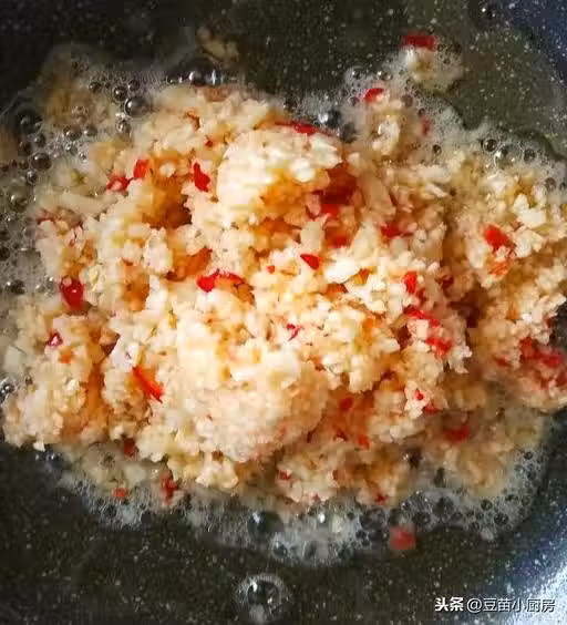 鍋里倒油,油的量比平時炒菜多一倍,放入蒜末,小米椒末,小火翻炒,一定要小火,防止糊鍋,味道會變苦的。