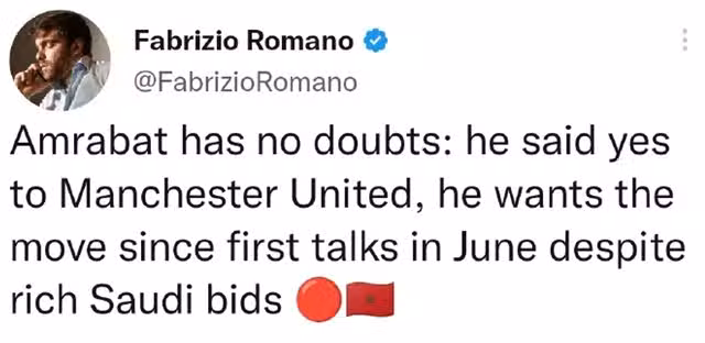 雖然這位摩洛哥後腰,也收到沙特聯的邀請,但是他一心想加盟曼聯。由於曼聯這個夏窗支出已經超標,因此阿姆拉巴特只能等待。只有滕能夠成功送走范德貝克和弗雷德等人,曼聯才有可能簽下阿姆拉巴特。