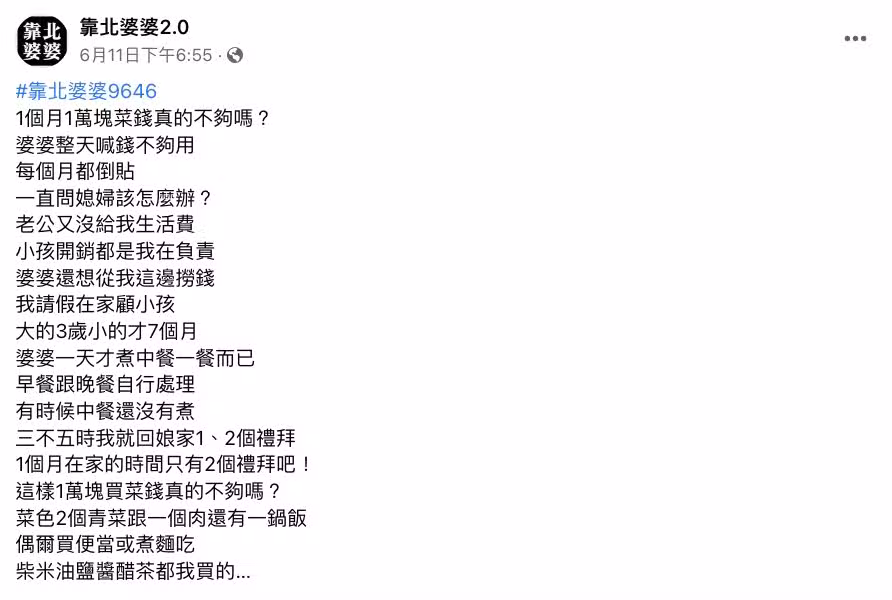 婆婆喊菜錢不夠用!媳婦愣住「1個月1萬塊不夠嗎」:小孩都我負責 「公開家中花費」網友一面倒心疼