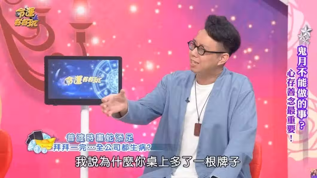 據《三立新聞》報導,命理師簡少年近日在《命運好好玩》指出,現在普渡的儀式、規矩,在網路上都有很多資料,查詢很方便,但他有很多年輕創業家,喜歡在普渡上發揮「創意」,他透露有位朋友拜完後,不僅全公司的人生病,他自己也重病,對方將普渡時的照片傳給簡少年,簡少年就覺得怪怪的:「為什麼你桌上多了一個牌子?」