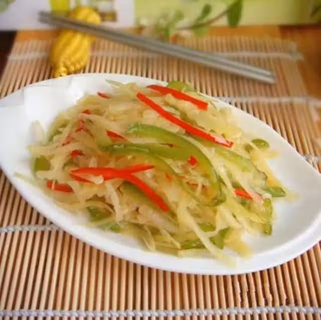 這道零廚藝的菜肴,關鍵先要把土豆絲泡洗乾淨,土豆是含澱粉量很好的,很容易粘鍋哦。