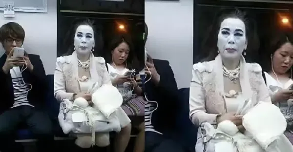 夭壽哦!捷運驚現恐怖「白臉女子」,眼尖網友發現她脖子「1細節」後狂刷:快報警