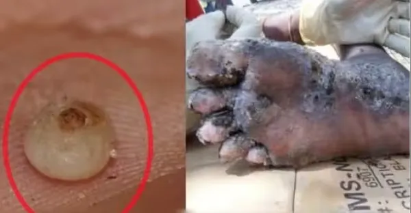 只要被它鑽進腳底板產下一個卵,兩周時間就可以繁殖成成百上千個卵,差不多就可以截肢了...
