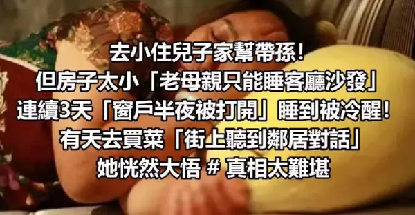 去小住兒子家幫帶孫! 但房子太小「老母親只能睡客廳沙發」,連續3天「窗戶半夜被打開」睡到被冷醒!有天去買菜「街上聽到鄰居對話」她恍然大悟 真相太難堪