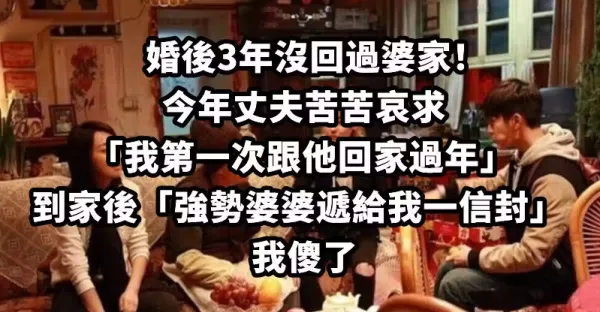 婚後3年沒回過婆家!今年丈夫苦苦哀求「我第一次跟他回家過年」 到家後「強勢婆婆遞給我一信封」我傻了