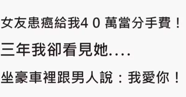 女友患癌反而給我40萬當分手費!三年我卻看見她坐在豪車裡跟男人說:我好愛你!