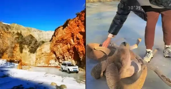 女子新疆自駕游,發現一隻羊「凍僵冰中」心疼撫摸,網友急喊:不要碰!