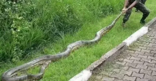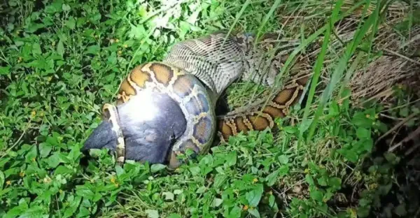3.7米52斤重巨蟒正吞黑山羊,吃到一半被員警制止,強行從蛇口拖出,大蟒心裡苦:羊都涼了還不如給我吃了
