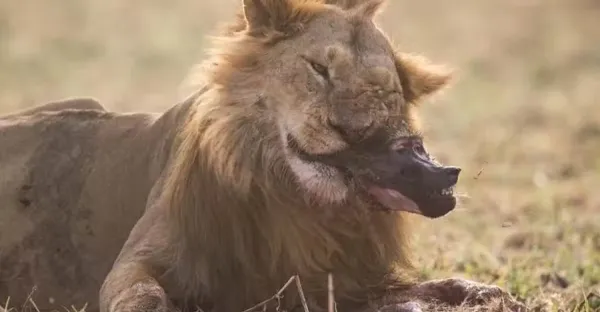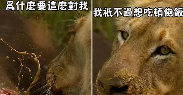 饑腸轆轆的母獅按倒野牛,剛要美餐下秒「屎漿噴滿臉」,母獅表情複雜生無可戀