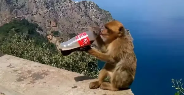 猴子從遊客手中「搶來可樂」,在懸崖邊沒喝幾口,就樂極生悲了