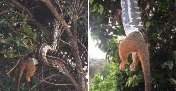 澳洲巨蟒倒掛吞碩大負鼠,從天而降引來遊客圍觀,鼠頭已入蛇肚只留粗長大尾巴