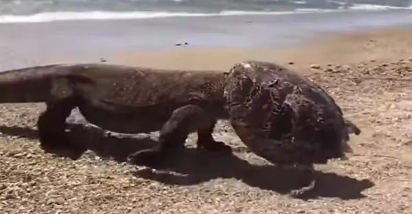 帶著「頭盔」的怪龍一步步走上沙灘:科莫多龍為吃光龜肉鑽進龜殼,合體成「科莫多龍龜」