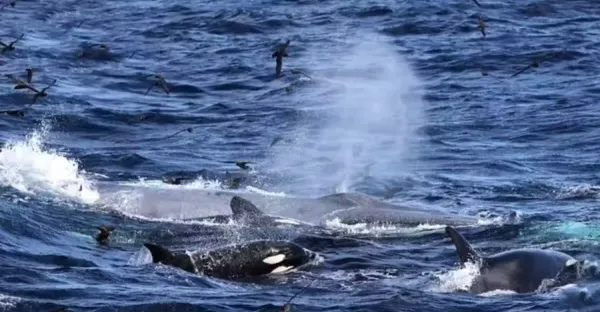 15米藍鯨誤入領地,遭75頭虎鯨圍攻,硬抗三小時後落敗,海鳥集群與虎鯨共食藍鯨肉