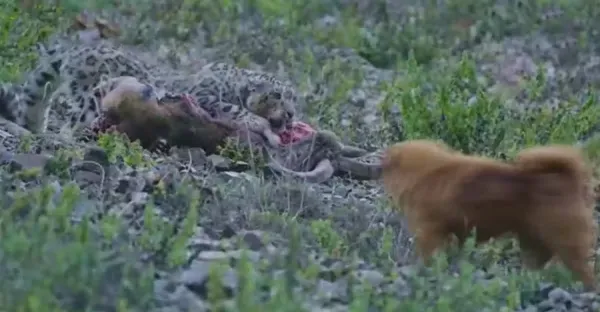 喜馬拉雅母雪豹耗時2天捕食,拖獵物回去喂幼崽,遭一群藏獒搶食