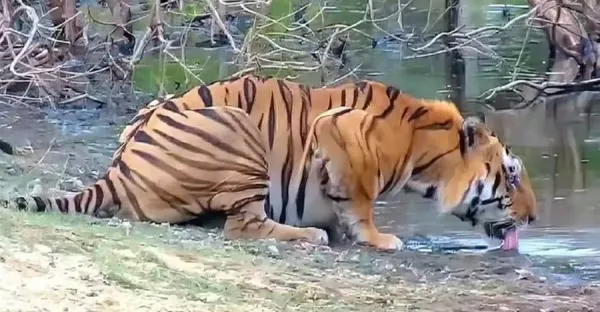 老虎正在喝水,突然感覺背後一涼,一轉頭嚇得拔腿就跑