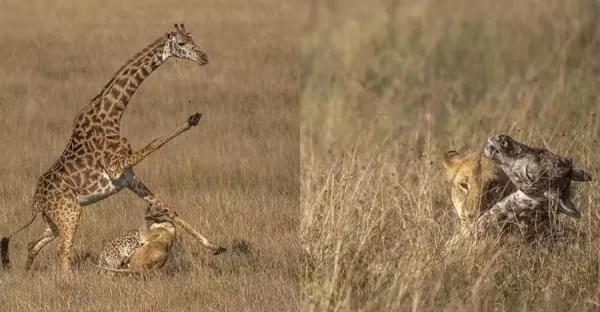 當非洲獅盯上長頸鹿母子,鹿媽媽保護幼崽兇猛反擊,不料獅子眼中只有小鹿