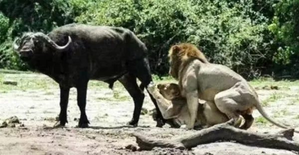 母獅捕食野牛,雄獅不幫忙反而撲到母獅背上,野牛逃脫追著雄獅跑