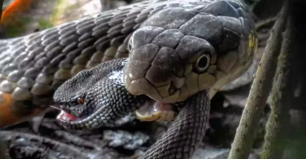 眼鏡王蛇兩小時連吞兩條毒蛇,「竹葉青+狗面水蛇」套餐,第三條由於太小撿回一條命