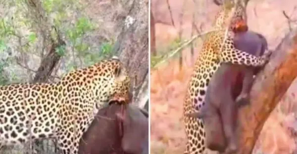 豹子「捕食小犀牛」,帶上樹準備享用,接下來的一幕卻讓人意外:太尷尬了