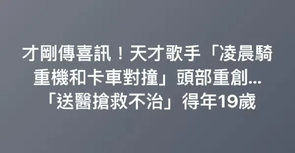 才剛傳喜訊!天才歌手「凌晨騎重機和卡車對撞」頭部重創...「送醫搶救不治」得年19歲