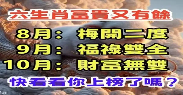 六生肖富貴又有餘,8月梅開二度,9月福祿雙全,10月財富無雙