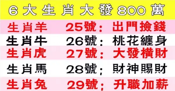 1月25到29號六大生肖大發800萬,本月最後幾天要暴富