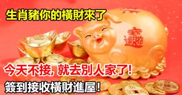 生肖豬「你的橫財來了」, 今天不接, 就去別人家了! 簽到接收橫財進屋!