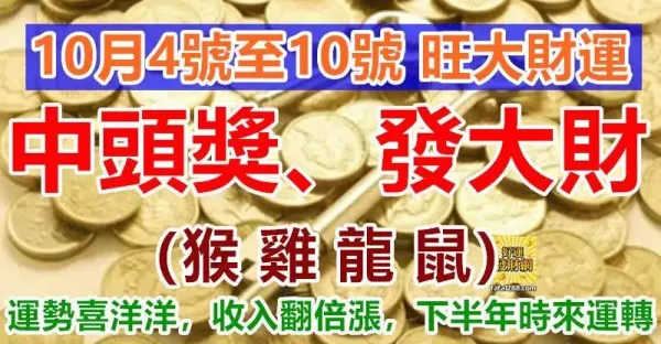 10月4號至10號旺大財運,中頭獎發大財,4生肖運勢喜洋洋,收入翻倍漲,下半年時來運轉