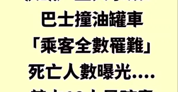 快訊/重大事故!巴士撞油罐車「乘客全數罹難」死亡人數曝光....其中19人是孩童