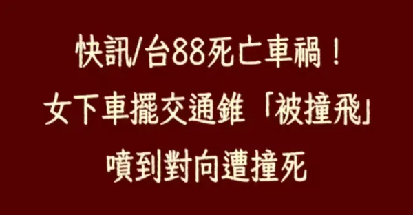 快訊/台88死亡車禍!女下車擺交通錐「被撞飛」,噴到對向遭撞死