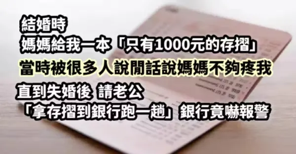 結婚時,媽媽給我一本「只有1000元的存摺...」,當時被很多人說閒話,說媽媽不夠疼我,直到失婚後,請老公「拿存摺到銀行跑一趟」,銀行竟嚇報警