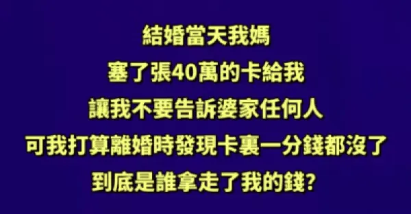 結婚當天我媽塞了張40萬的卡給我,讓我不要告訴婆家任何人,可我打算離婚時,發現卡里一分錢都沒了,到底是誰拿走了我的錢?