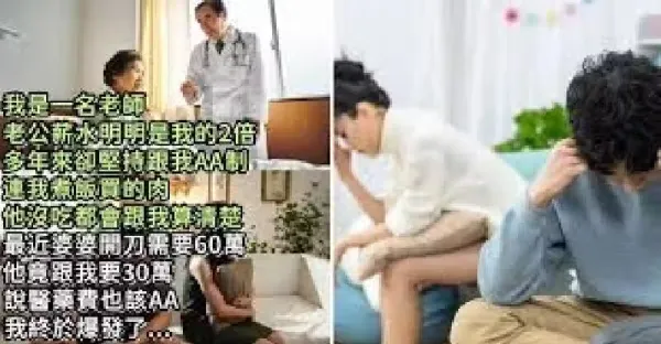 我是一名老師,老公薪水明明是我2倍,多年來卻堅持跟我AA制,連我煮飯買的肉他沒吃都會跟我算清楚!最近婆婆開刀需要60萬,他竟跟我要30萬說醫藥費也該AA,我終於爆發了...