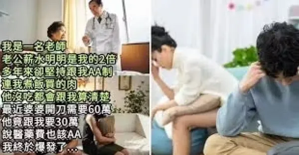 我是一名老師,老公薪水明明是我2倍,多年來卻堅持跟我AA制,連我煮飯買的肉他沒吃都會跟我算清楚!最近婆婆開刀需要60萬,他竟跟我要30萬說醫藥費也該AA,我終於爆發了……