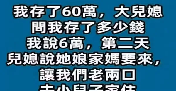 我存了60萬,大兒媳問我存了多少錢,我說6萬,第二天兒媳說她娘家媽要來,讓我們老兩口去小兒子家住,小兒媳立馬歡天喜地接我們過去了那架勢,仿佛我們多待一秒都是多餘的~